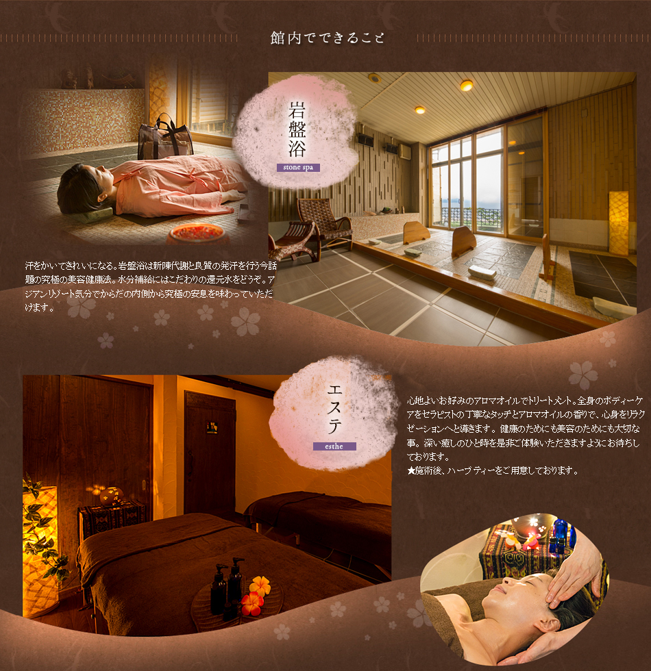 岩盤浴は新陳代謝と良質の発汗を行う今話題の究極の美容健康法。水分補給にはこだわりの還元水素水をどうぞ。アジアンリゾート気分でからだの内側から究極の安息を味わっていただけます。
